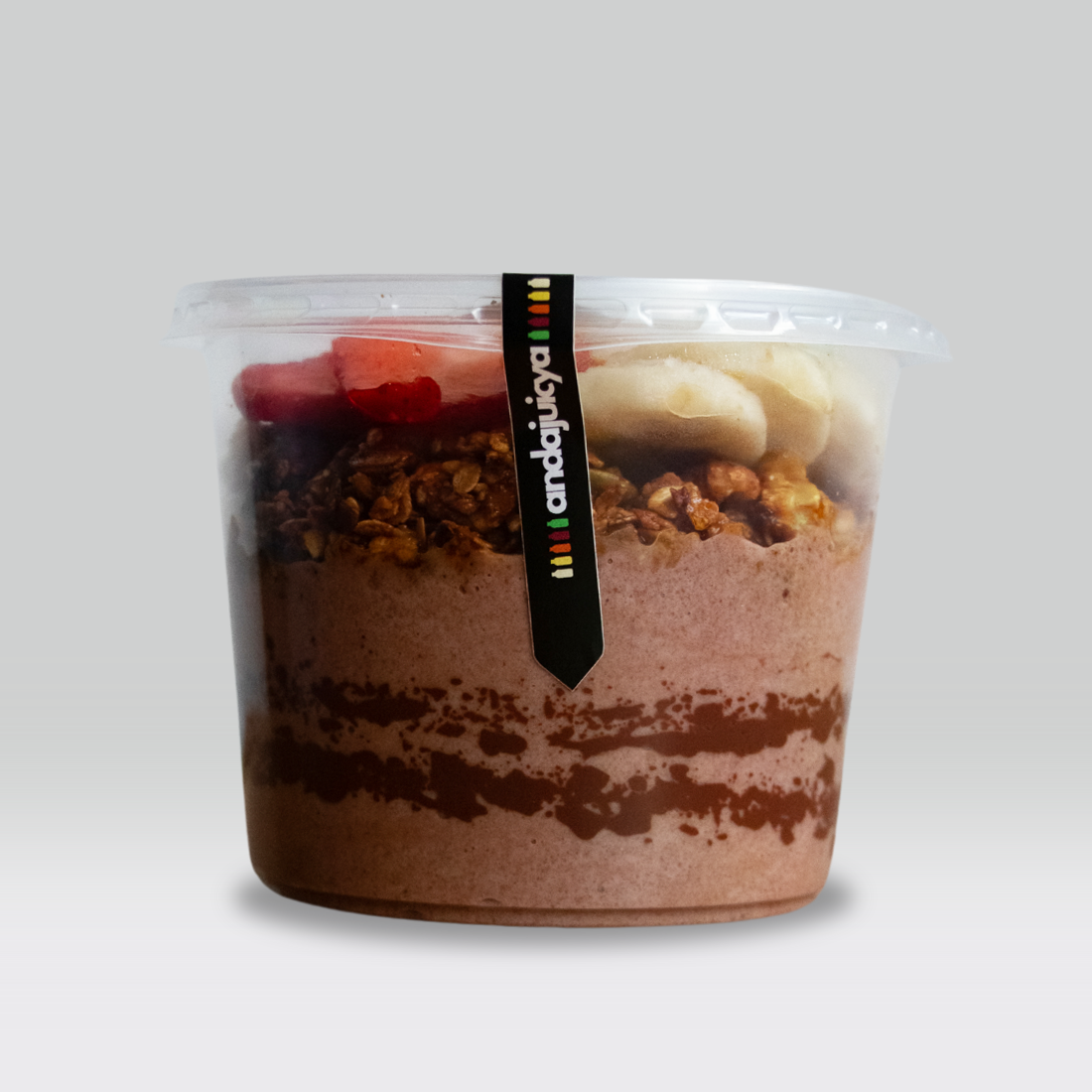 We start with creamy natural yogurt blended with rich, organic, fair trade Peruvian cacao. It’s then topped with our now-legendary homemade gluten-free granola—a nutrient-packed mix of over five different nuts and super seeds. Finished with fresh banana, strawberries, a generous swirl of peanut butter, and a sprinkle of bee pollen, this bowl is a powerhouse of flavour and goodness.