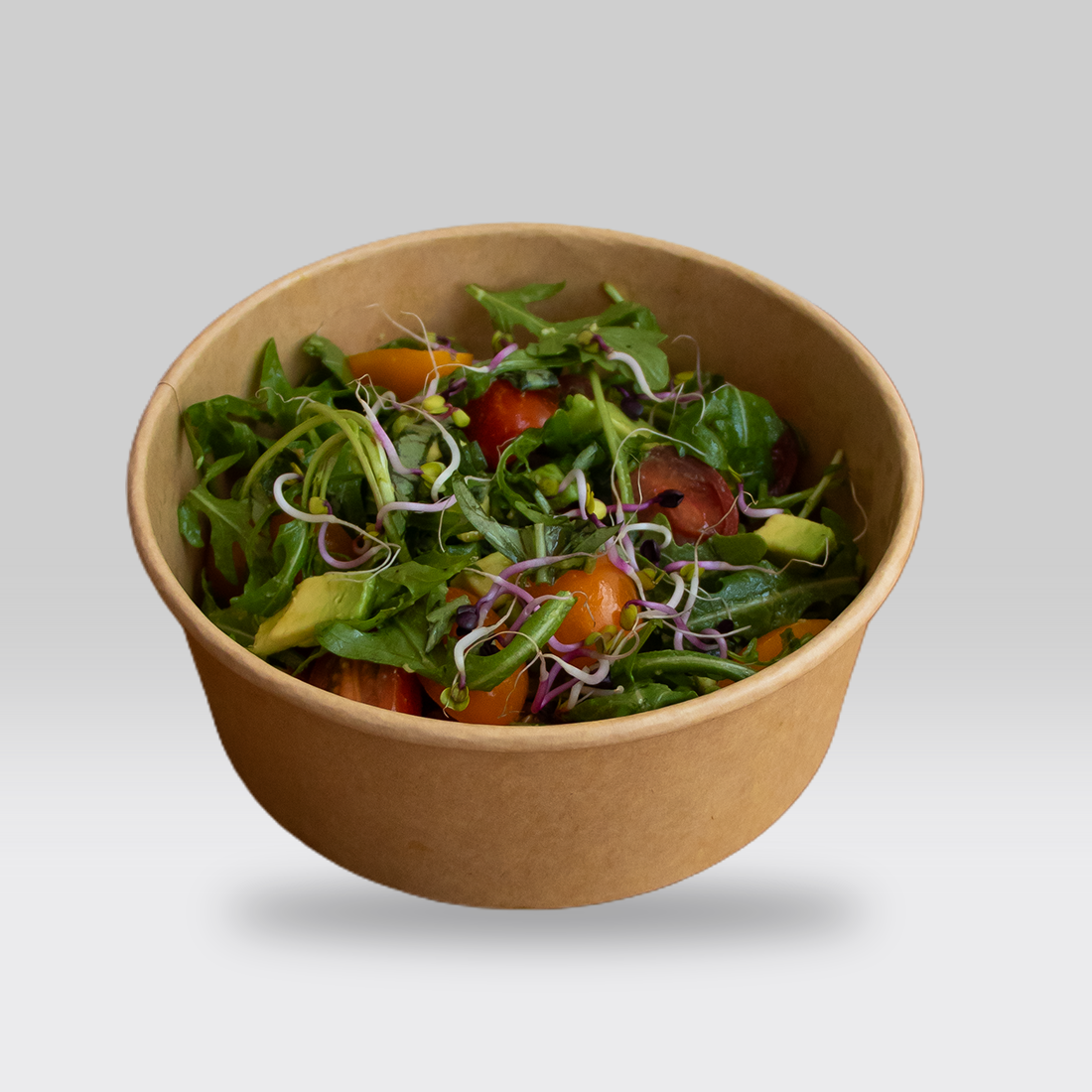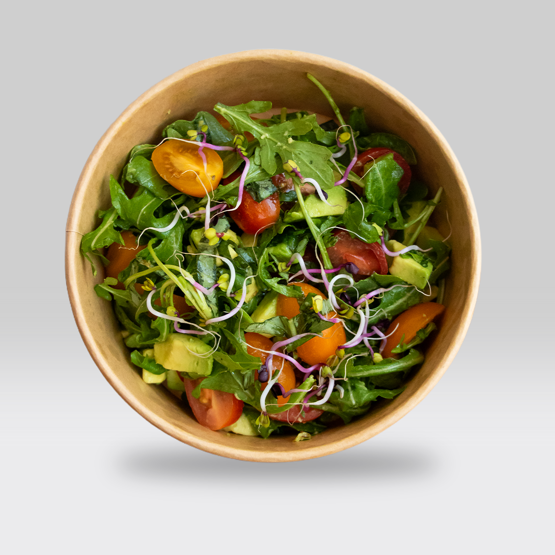 Fresh cherry tomatoes (we use five different types), Avocado, Basil and Roquette tossed in a fresh olive oil. All sourced locally, from farm to plate really quite quickly!